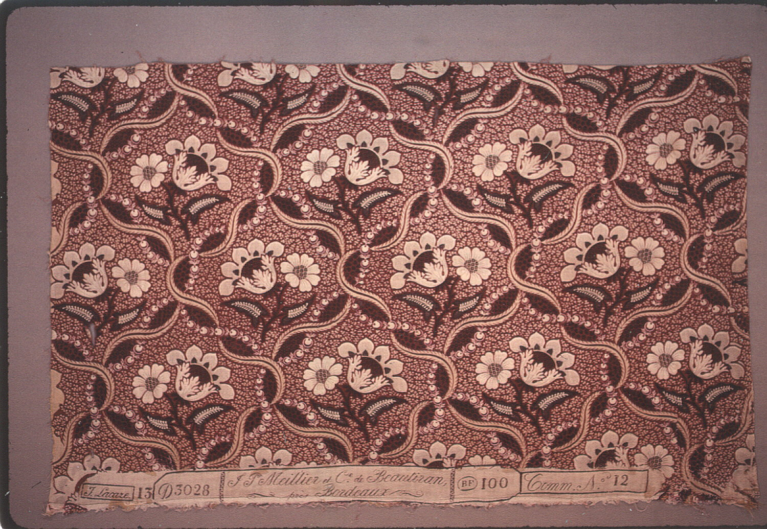 Textile (France); Company: J.P.Meiller et Cie.; cotton; Warp: 54 cm (21 1/4 in.). Weft: 82.5 cm (32 1/2 in.). All edges of fabric are cut. Pattern: Height: 25 cm (10 in.). Width: 20 cm (8 in.).; Gift of Cora Ginsburg; 1994-80-19