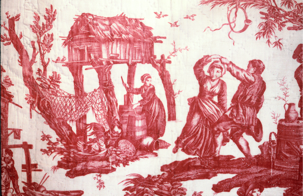 Chef De Piece, "L'Abreuvoir" (The Well); Designed by Jean-Baptiste Huët (1745 – 1811); Manufactured by Oberkampf & Cie. (France); France; plain weave cotton; Height: 63cm (24 3/4in.). Width: 145cm (55 1/4in.) N.B. As the piece is quilted to a backing fabric with no apparent warp or weft, measurements were taken as Height and Width. Pattern: Not present in piece.; Gift of Cora Ginsburg; 1994-80-2