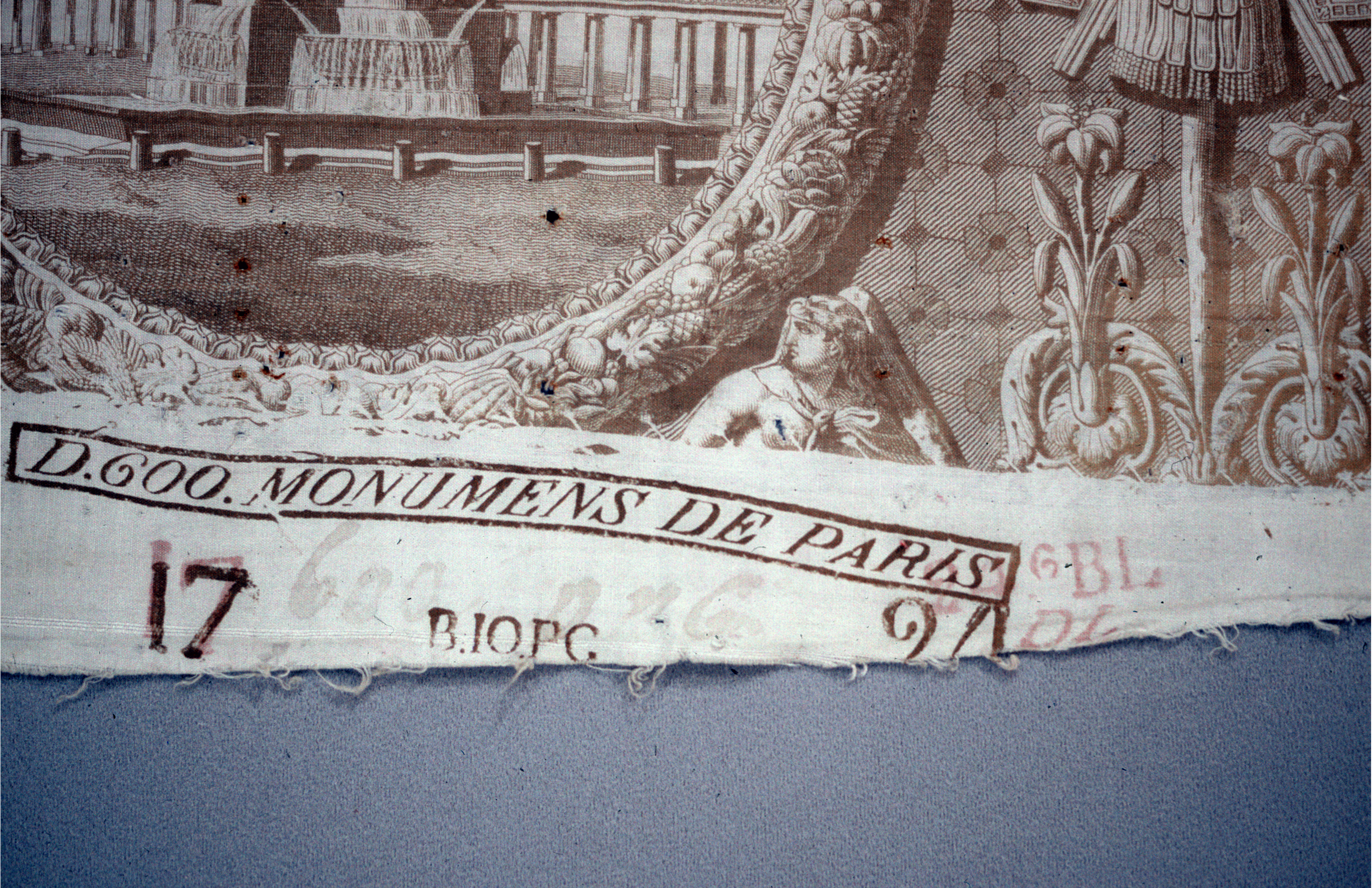 Stamp at the end of one length bearing half of the Oberkampf factory mark in use from 1792 to 1815. Also in brown: D600 Monumens de Paris (within box), 17, BIOPG, 24. In red: 24(6)BL and DL. Handwritten in ink (very faded): 600 DNG.