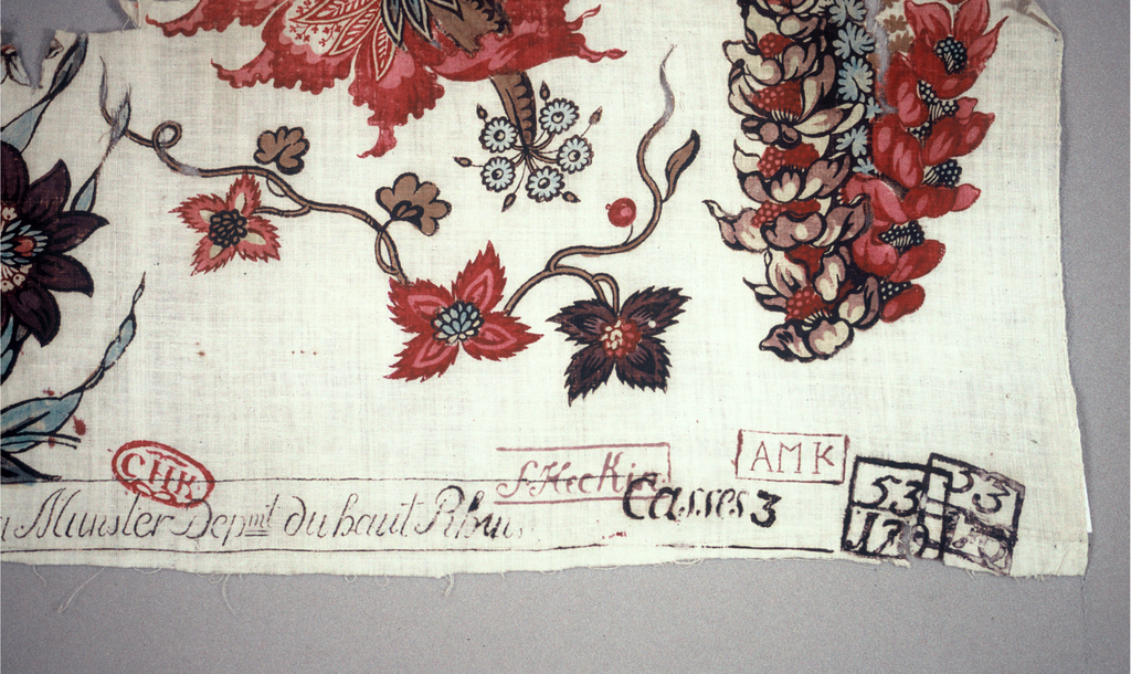 Printed on front: "Manufre de Toiles Peintes de Soehnee L'aine et C a Munster Depmt du Haut Rhin" in black. And; "MSA" within box in black, "CHK" within oval in red, "S, K(or H)eckir"within box in purple, "AMK" within box in purple, "Casses 3" in black, "53 over 170" within box, printed twice. No stamps on back of fabric.