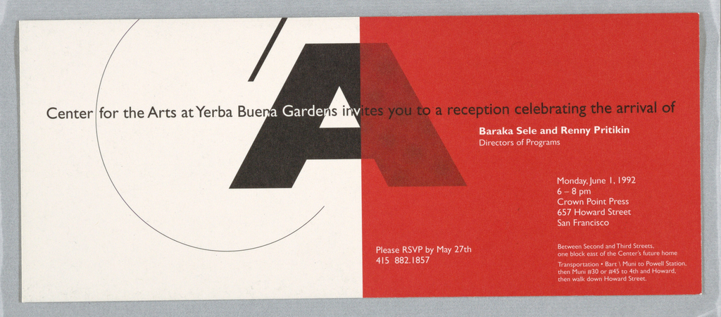 Invitation, Reception for Baraka Sele and Ronny Pritikin, Center for the Arts, Yerba Buena Gardens, San Francisco, June 1, 1992; USA; offset lithograph on heavy paper; 9.4 x 22.1 cm (3 11/16 x 8 11/16 in.); Gift of Lucille Tenazas; 1994-87-15