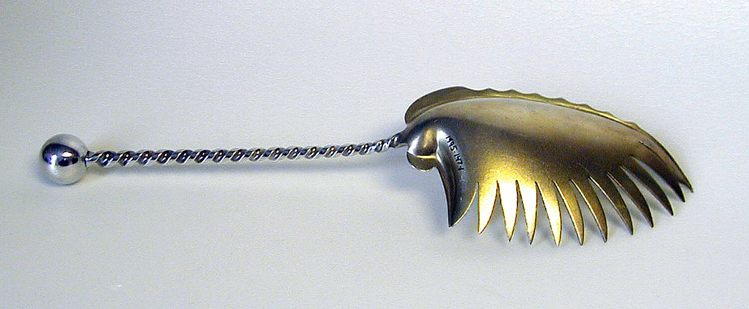 Macaroni Server with Gold Plated Bowl Server; USA; gold plated, silver; L x W x D: 26.7 × 7 × 4.2 cm (10 1/2 × 2 3/4 × 1 5/8 in.); Museum purchase from Decorative Arts Association Acquisition and Dona Guimaraes Funds; 1995-147-1