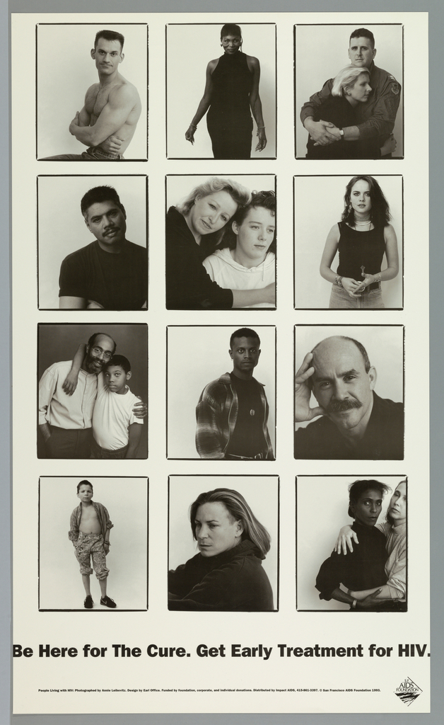 Printed in black ink, lower margin: People Living with HIV: Photographed by Annie Leibovitz. Design by Earl Office. Funded by foundation, corporate, and individual donations. Distributed by Impact AIDS, 415-861-3397. San Francisco AIDS Foundation 1993.