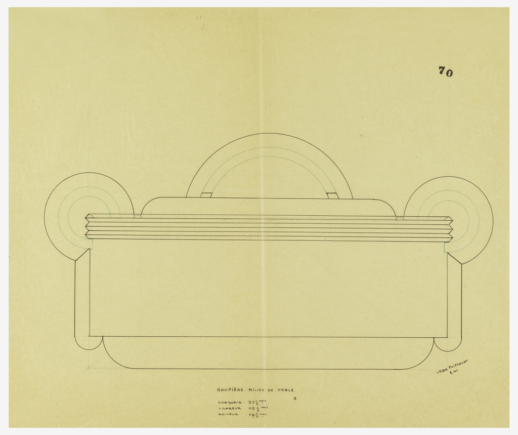 Inscribed in black ink, lower center: SOUPIERE MILIEU DE TABLE/3/LONGUEUR: 37 1/2 cms/LARGEUR 25 1/2 cms/HAUTEUR 19 1/2 cms