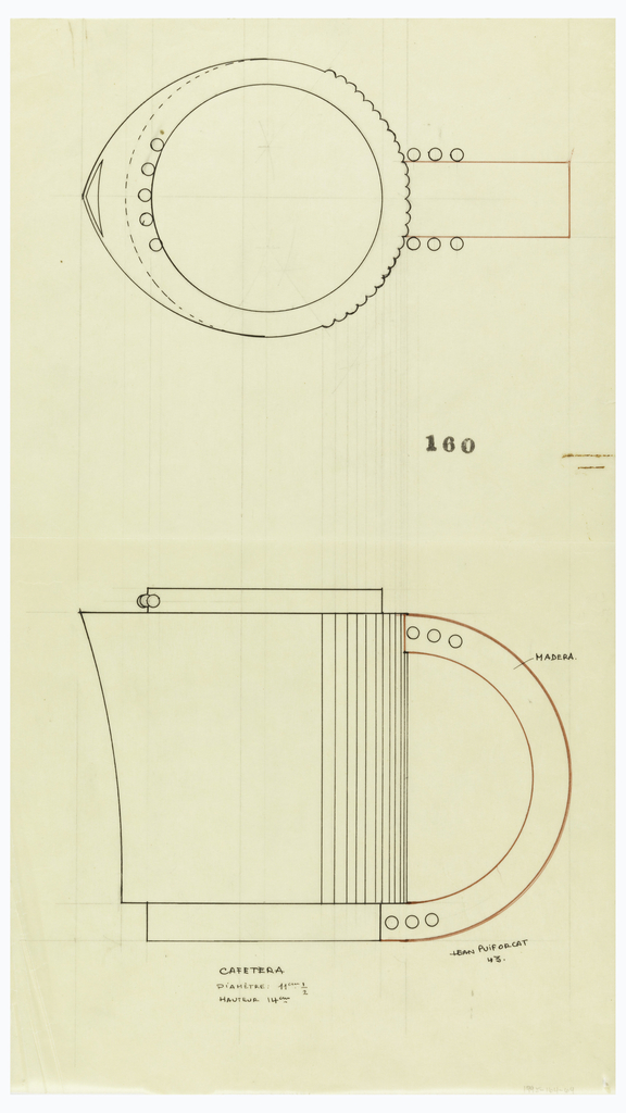 Inscribed in black ink, lower center: CAFETERA/DIAMETRE: 11 cms 1/2/HAUTEUR 14 cms; lower right: JEAN PUIFORCAT/43; to upper right of handle: MADERA