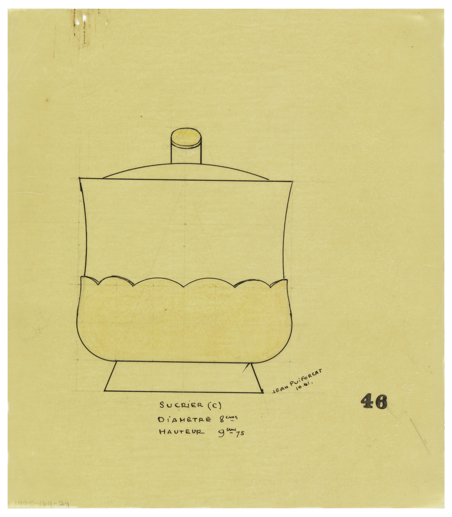 Inscribed in black ink, lower center: SUCRIER (C)/DIAMETRE 8 cms/HAUTEUR 9 cms 75; lower right: JEAN PUIFORCAT/10.41.