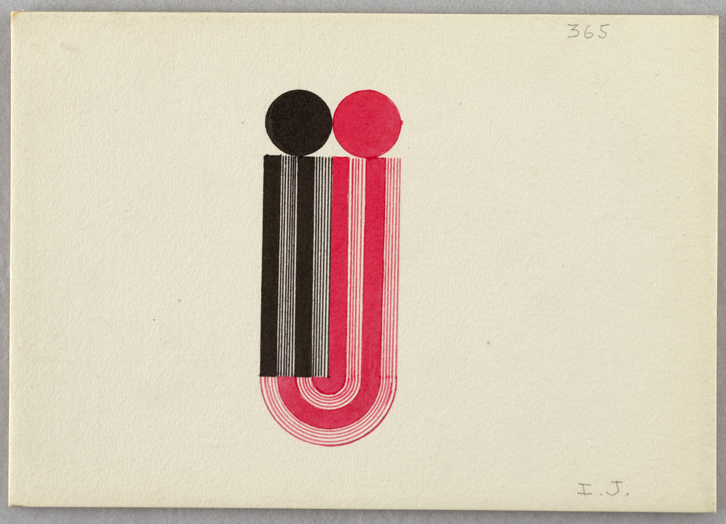 Drawing, Design for a Monogram: I.J.; Designed by Jean Elysée Puiforcat (French, 1897–1945); France; pen and black and red ink; brush and black ink, red watercolor; graphite on cream illustration board; 10.8 x 15.4 cm (4 1/4 x 6 1/16 in. ); Gift of John Finguerra in memory of his brother Jim Finguerra; 1995-164-91