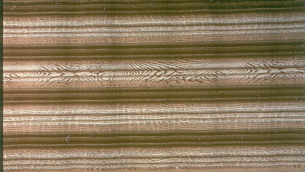 Wallpaper imitating decorative wood paneling such as bead board. Regularly spaced channels or grooves give the design a tromp l’oeil effect creating a strong vertical which would make a wall appear taller. There is a long tradition of wood grain wallpapers and they have been produced by every printing technique.