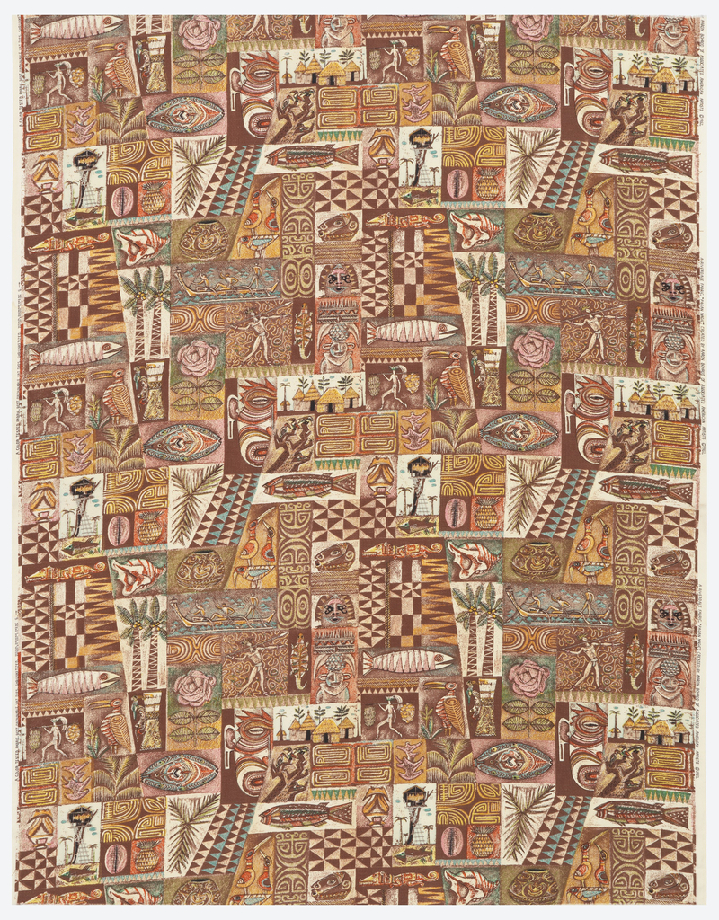 Textile, Pagan Magic; Designed by Aaron Bohrod (American, 1907–1992); Produced by Riverdale Drapery Fabrics; Made for Associated American Artists (United States); USA; cotton; H x W: 153.7 x 120.7 cm (60 1/2 x 47 1/2 in.); Museum purchase from General Acquisitions Endowment Funds; 1995-48-2