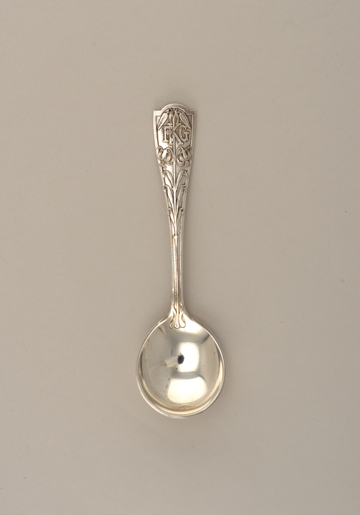 This is a spoon. It was designed by George Washington Maher and manufactured by Gorham Manufacturing Company and made for (as the client) Ernest L. and Grace King and retailed by Spaulding & Co.. It is dated 1911–12 and we acquired it in 1995. Its medium is silver. It is a part of the Product Design and Decorative Arts department.