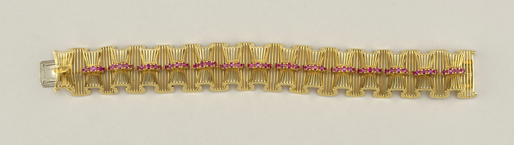 This is a bracelet. It was manufactured by Tiffany and Co.. It is dated ca. 1950 and we acquired it in 1995. Its medium is gold, rubies. It is a part of the Product Design and Decorative Arts department.