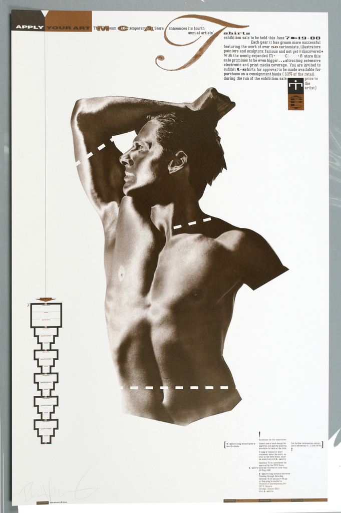 Printed in white and black, upper left: APPLY YOUR ART; in black and brown, upper center and right: The Museum of Contemporary Art Store announces its fourth / annual artists’ / T shirts / exhibition sale to be held this June 7>19-88 / Each year it has grown more successful / featuring the work of over 50 cartoonists, illustrators / painters and sculptors; famous and not yet discovered. / With the newly expanded M< C >A store this / sale promises to be even bigger. . . attracting extensive / electronic and print media coverage. You are invited to / submit t-shirts for approval to be made available for / purchase on a consignment basis (60 % of the retail / price to / the / artist) during the run of the exhibition sale; in black, below, vertically: APPLY; in black and brown, at left, within application form boxes: APPLY / artist’s name / address / daytime phone / description / quantity available / retail $ / description / quantity available / retail $ / description / quantity available / retail $ / description / quantity available / retail $ / description / quantity available / retail $; in brown and black, lower left: DESIGN rick valicenti 4 thirst; in black, lower right, first column: [t-shirts may be multiples or / one-of-a-kind.; in brown and black, lower right, second column: Guidelines for the submission: / Submit one of each design for / approval and specify quantity / available for sale on the form. / A copy of resume or short / statement about the work, as / well as the form below, must / be submitted with t-shirts. / Deadline: To be considered for / approval by the MCA Store, / t-shirts must be received no later than / 24 May 1988. / t-shirts may be hand delivered / Monday through Saturday / between 10:00 am and 4:45 pm / or they may be mailed to / Museum of Contemporary Art / 237 E. Ontario / Chicago, Illinois 60611 / Attn: t-shirts; in black, lower right, third column: For further information contact / Chris DerDerian 3 1 2.280.2679.]; in brown and black, bottom right: PHOTO ken reid MODEL john economou/almada STYLing darcy mcgrath/elite