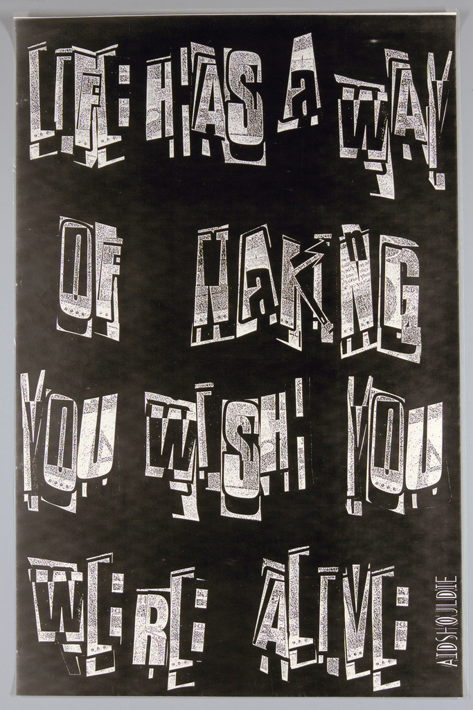 Printed in white and black, throughout composition: LIFE HAS A WAY / OF MAKING / YOU WISH YOU / WERE ALIVE; in black and white, lower right, vertically: AIDSHOULDIE