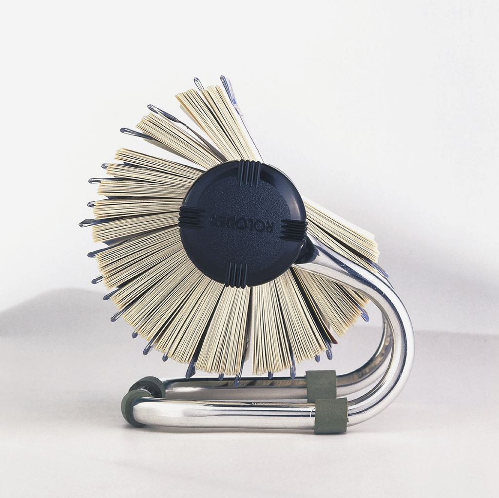 Composed of a curved tubular metal stand, a plastic wheel, and cards, this file for storing names, addresses, and phone numbers is an artifact of the pre-digital office. Turning the wheel flips the cards, creating multiple planes. Some electronic versions are designed to evoke the tactile qualities of the rotating wheel.