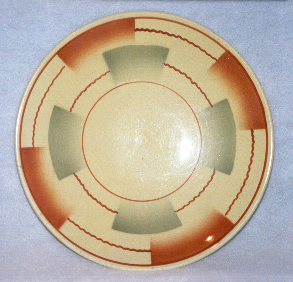 This is a plate. It was designed by Eva Zeisel and manufactured by Schramberger Majolikafabrik. It is dated 1928–30 and we acquired it in 1996. Its medium is earthenware. It is a part of the Product Design and Decorative Arts department.