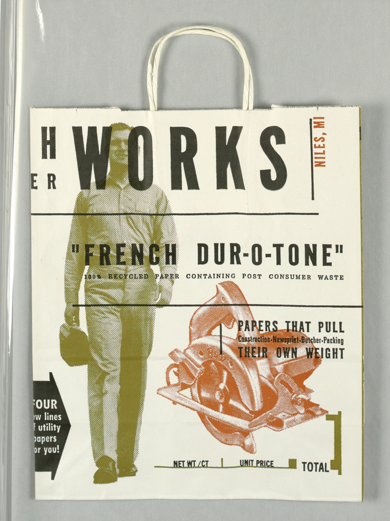 Shopping Bag, French Paper; Designed by Charles S. Anderson (1958); Manufactured by Modern Arts; Firm: Charles S. Anderson Design Company; USA; paper; 40.0 x 33.0 cm (15 3/4 x 13 in. ); Gift of Charles S. Anderson Design Company; 1996-29-2