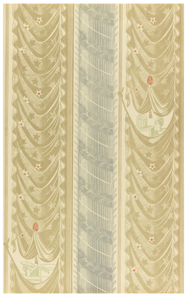 Edward Bawden was a watercolorist, book illustrator, mural painter, and designer. In 1925, Bawden saw William Morris’s wallpaper, Daisy, in an exhibition and was inspired to design his first wallpaper. Harold Curwen, of the Curwen Press, saw some of these early designs and wanted to transfer the pieces to his lithographic press so they could be reproduced and sold. Bawden designed 14 wallpapers between 1926 and 1933 for the Curwen Press. These papers are now quite rare.