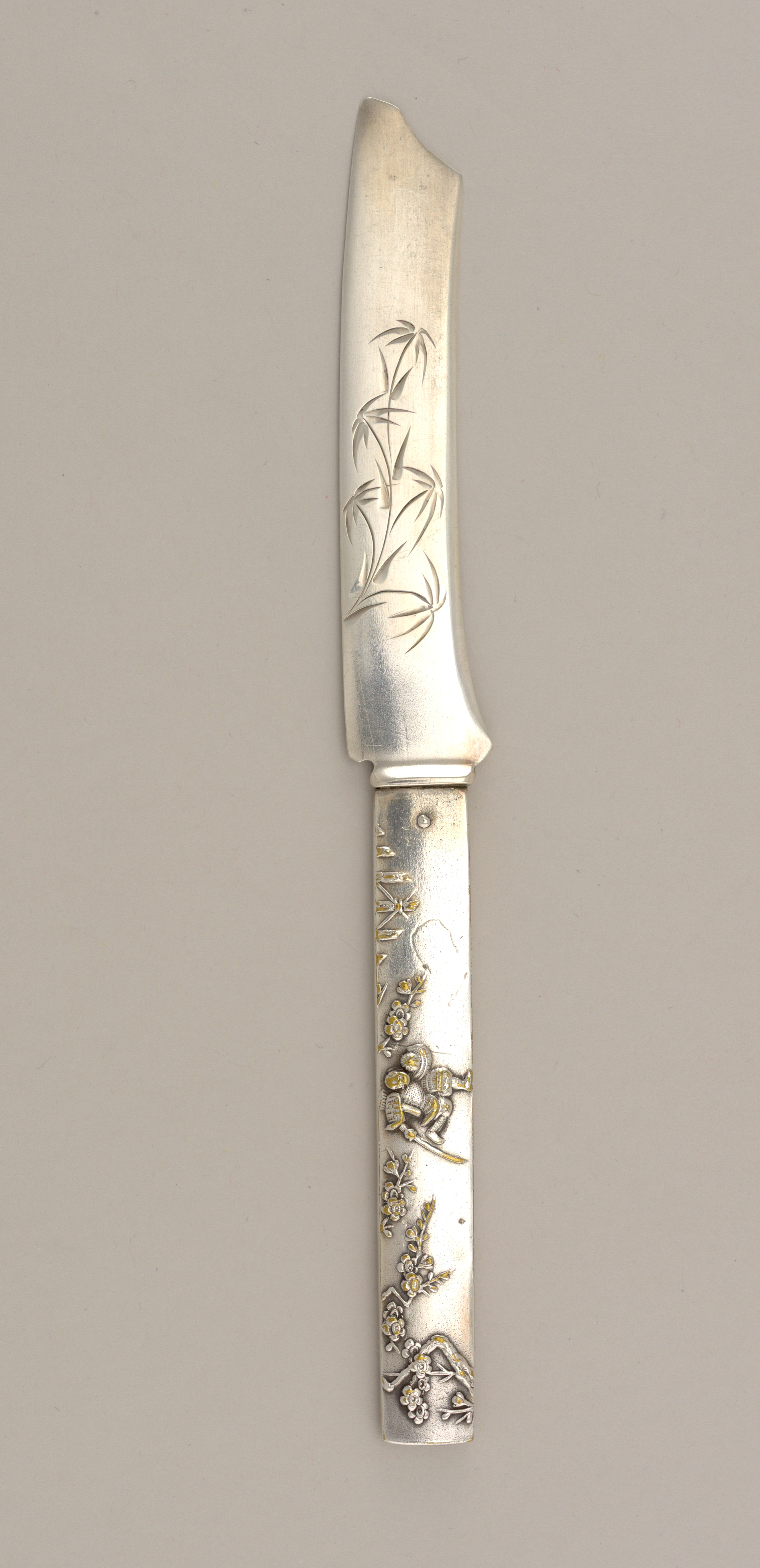 Japonesque Style Pattern Number 5 Frunit Knife Knife; Made by Gorham Manufacturing Company (United States); USA; gold plated, silver; L x W x D: 19.6 × 2.2 × 0.8 cm (7 11/16 × 7/8 × 5/16 in.); Museum purchase from General Acquisitions Endowment Fund; 1996-81-3