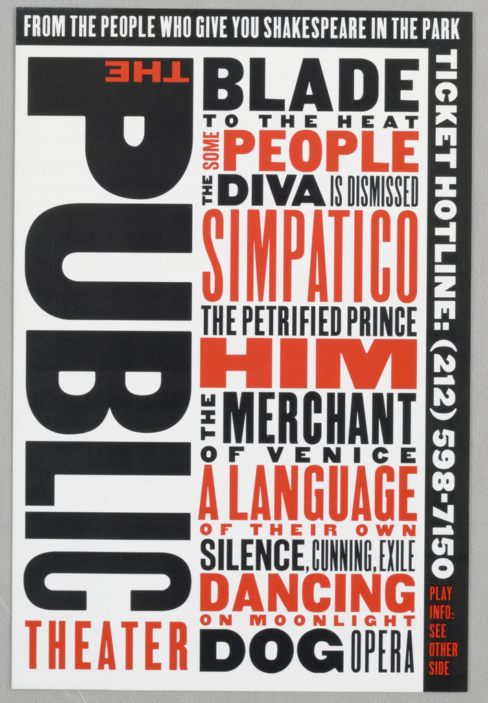 Flyer, Public Theater; Designed by Paula Scher (American, b. 1948); USA; offset lithograph on white paper; H x W: 23 x 15.3 cm (9 1/16 in. x 6 in.); Gift of Paula Scher; 1996-88-11