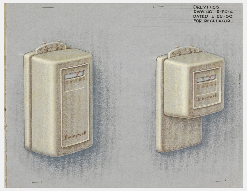 Drawing, Design for Two Regulators; Designed by Henry Dreyfuss (American, 1904–1972); USA; color pencil, graphite, pen and black ink, brush and white gouache on gray paper on illustration board, lined; 22.8 x 29.5 cm (9 in. x 11 5/8 in.); Gift of Honeywell, Inc.; 1997-10-20