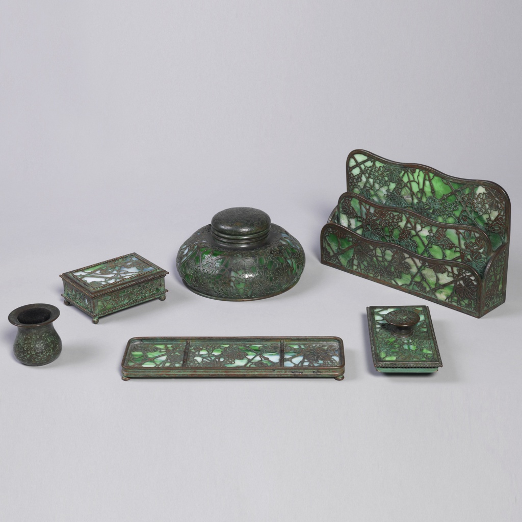 This is a Ink well and lid. It was designed by Louis Comfort Tiffany. It is dated ca. 1910-20 and we acquired it in 1997. Its medium is glass, bronze. It is a part of the Product Design and Decorative Arts department.