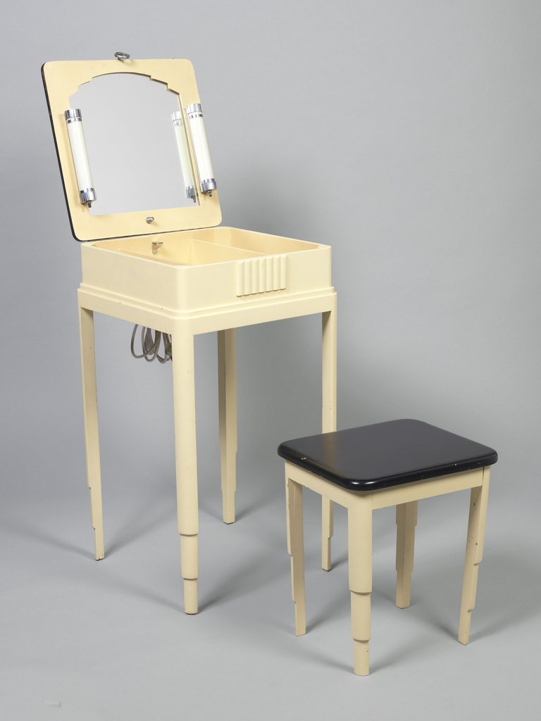 In the 1930s there was an increased focus on advertising home goods and furniture sets to female consumers. This Art Deco vanity table and bench, designed by Lurelle Guild for C. F. Church Manufacturing Company, were advertised in a spread stating: “At last you can bring beauty into your bathroom piece by piece – knowing that each and all will match perfectly in color, finish and design.”