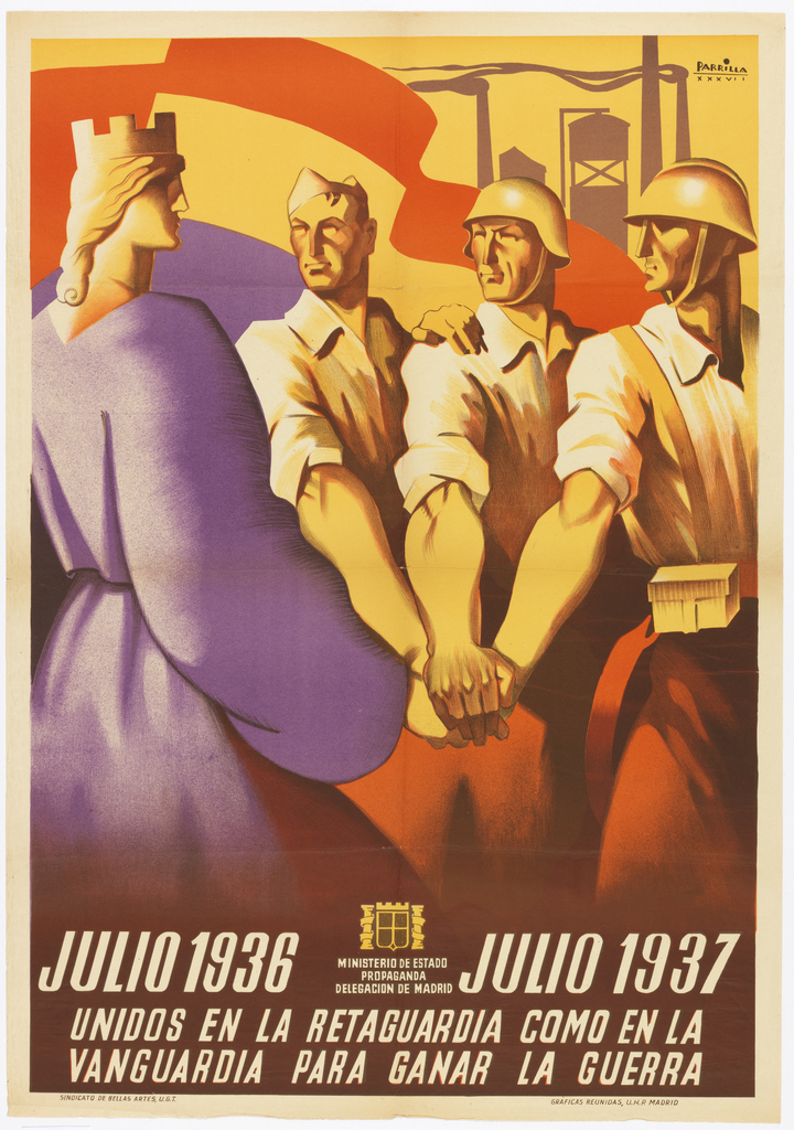 This is a Poster. It was designed by Parrilla and made for (as the client) Ministry of Propaganda. It is dated ca. 1936 and we acquired it in 1997. Its medium is lithograph on paper. It is a part of the Drawings, Prints, and Graphic Design department.