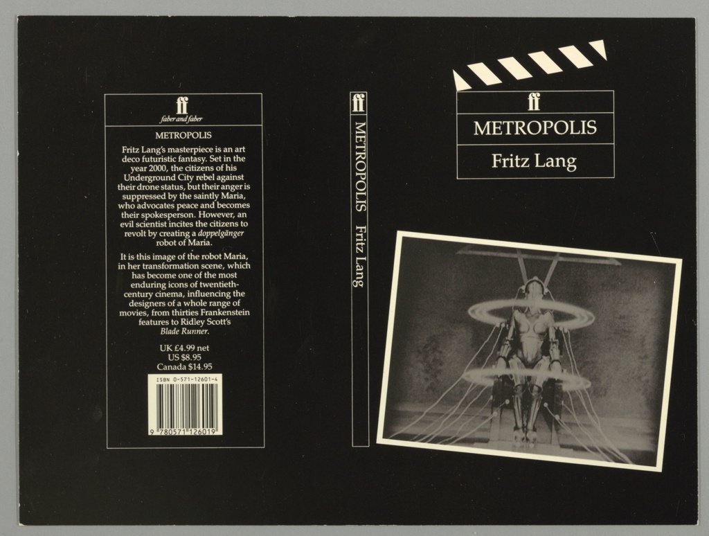 This is a Book Cover. It was designed by Jason Godfrey and written by Fritz Lang and published by Faber and Faber. It is dated 1989 and we acquired it in 1996. Its medium is offset lithograph on paper. It is a part of the Drawings, Prints, and Graphic Design department.
