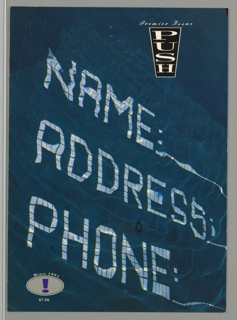 Recto, upper right: (in cursive letters) Premier Issue (below, vertically, white on black) PUSH Recto, lower left: (blue, encircled in gray) ! (above) March 1991 (below) $7.50 Verso: label containing collector and cataloguing information