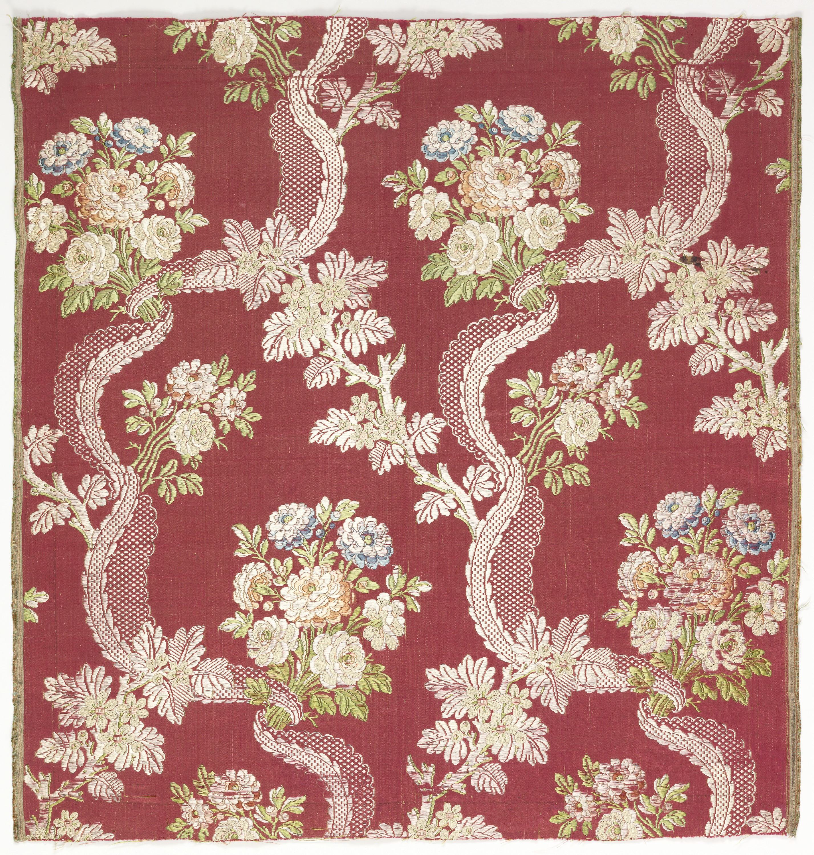 This is a Fragment. It is dated 19th century and we acquired it in 1998. Its medium is silk and its technique is 8-harness satin weave with weft floar patterning and discontinuous supplementary weft patterning (brocade). It is a part of the Textiles department.