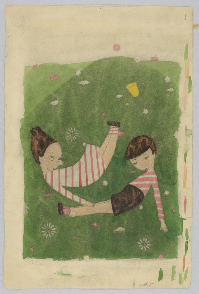 Drawing, Two Children Asleep on the Grass; Christina Malman (American, b. England, 1911–1959); USA; brush and watercolor on paper; (irregular): 46.9 x 31.4 cm (18 7/16 x 12 3/8 in.); Gift of Mrs. Just Lunning; 1997-179-2