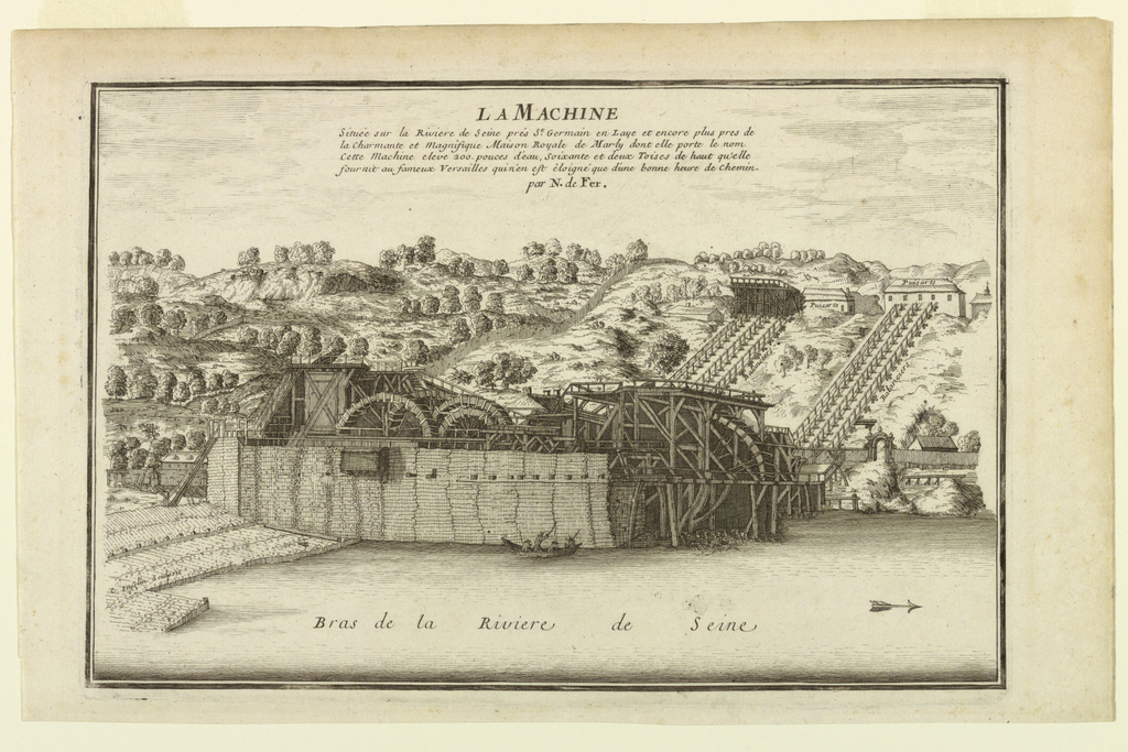 Print, The Machine de Marly Seen from the Seine River near St. Germain-en-Laye; After Nicolas de Fer (French, 1646–1720); Print Maker: Charles Inselin (French, b. ca. 1673); etching; Platemark: 23.4 x 34.4 cm (9 3/16 x 13 9/16 in. ); sheet (26 x 40.3 cm) 10 1/4 x 15 7/8 in.; Museum purchase from Smithsonian Institution Collections Acquisition Program Fund; 1998-1-2