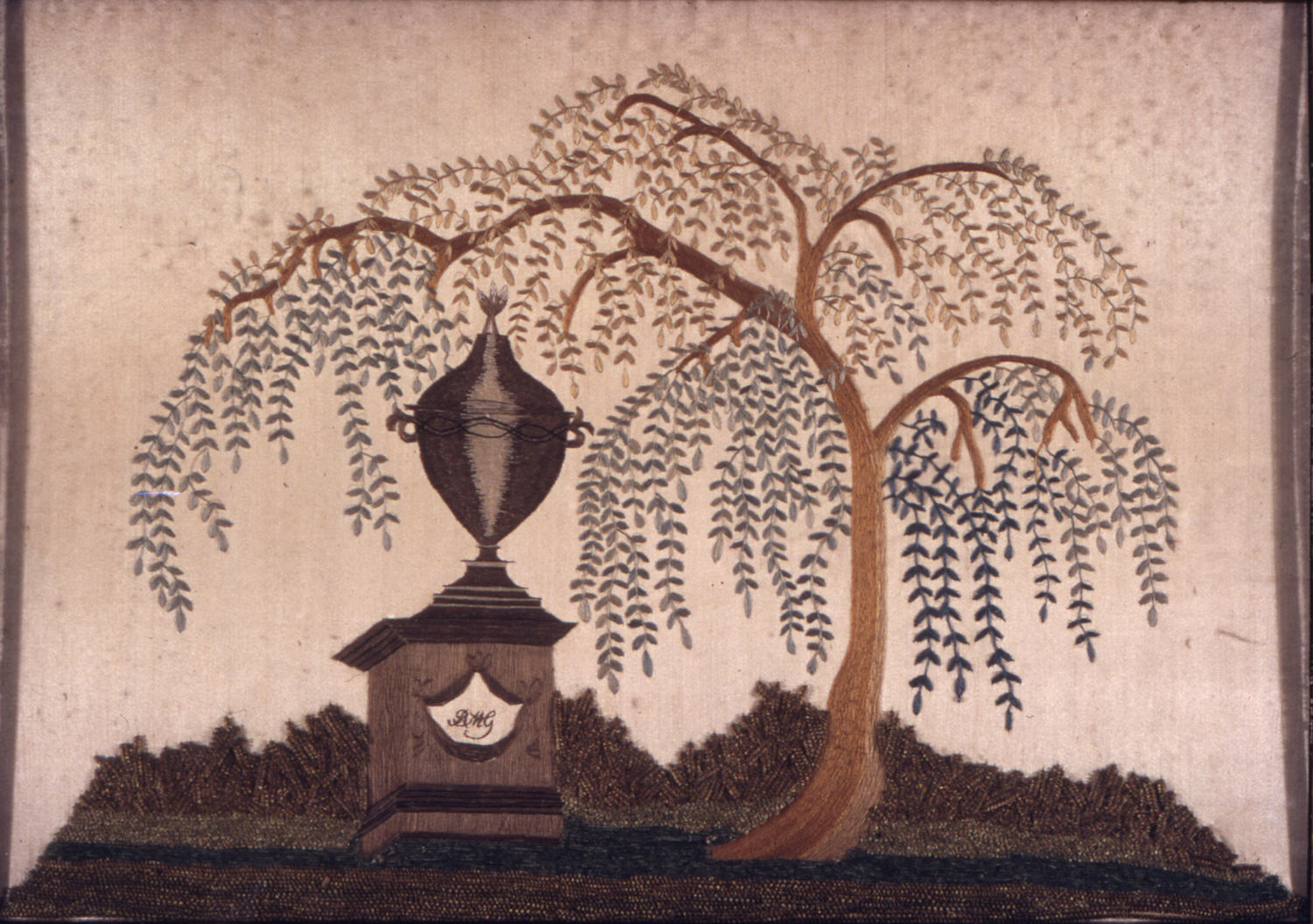 This is a Mourning sampler. It is dated ca. 1800 and we acquired it in 1974. Its medium is silk and its technique is embroidered and painted. It is a part of the Textiles department.