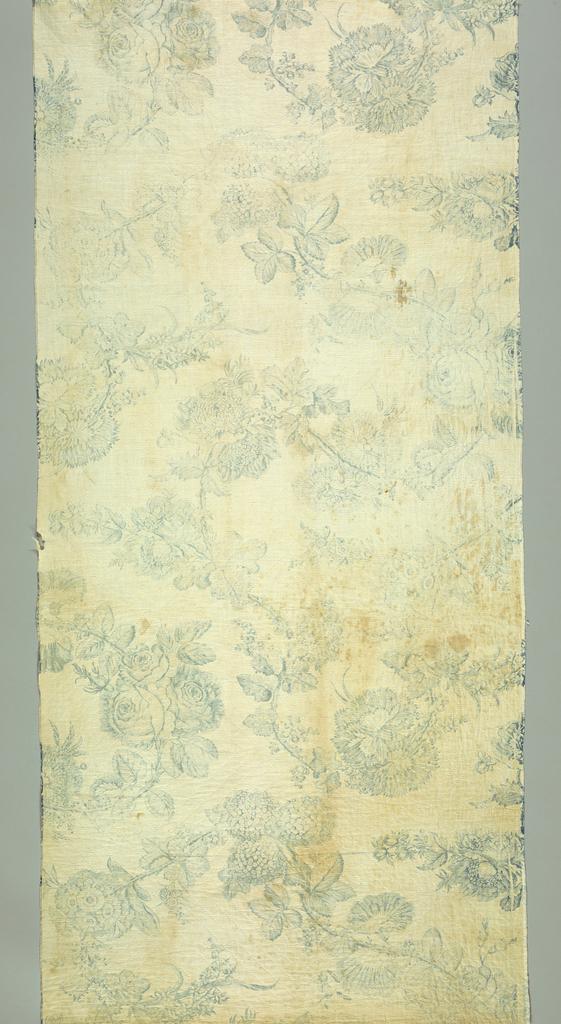 This is a Fragment. It was made by Bromley Hall. It is dated designed 1765–1770, printed after 1774 and we acquired it in 1995. Its medium is cotton and its technique is printed by engraved plate on plain weave. It is a part of the Textiles department.