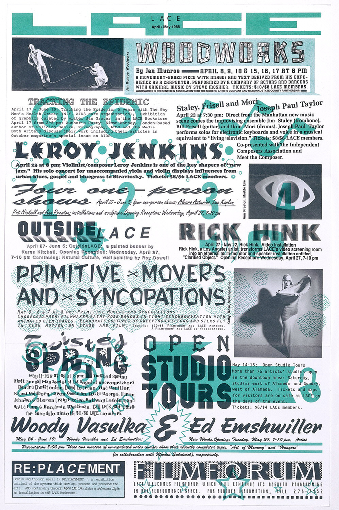 Newsletter, LACE Newsletter- April/May 1988; Designed by Jeffrey Keedy; USA; lithograph on white paper; 43.4 x 28 cm (17 1/16 in. x 11 in.); Gift of Jeffrey Keedy; 1997-50-4