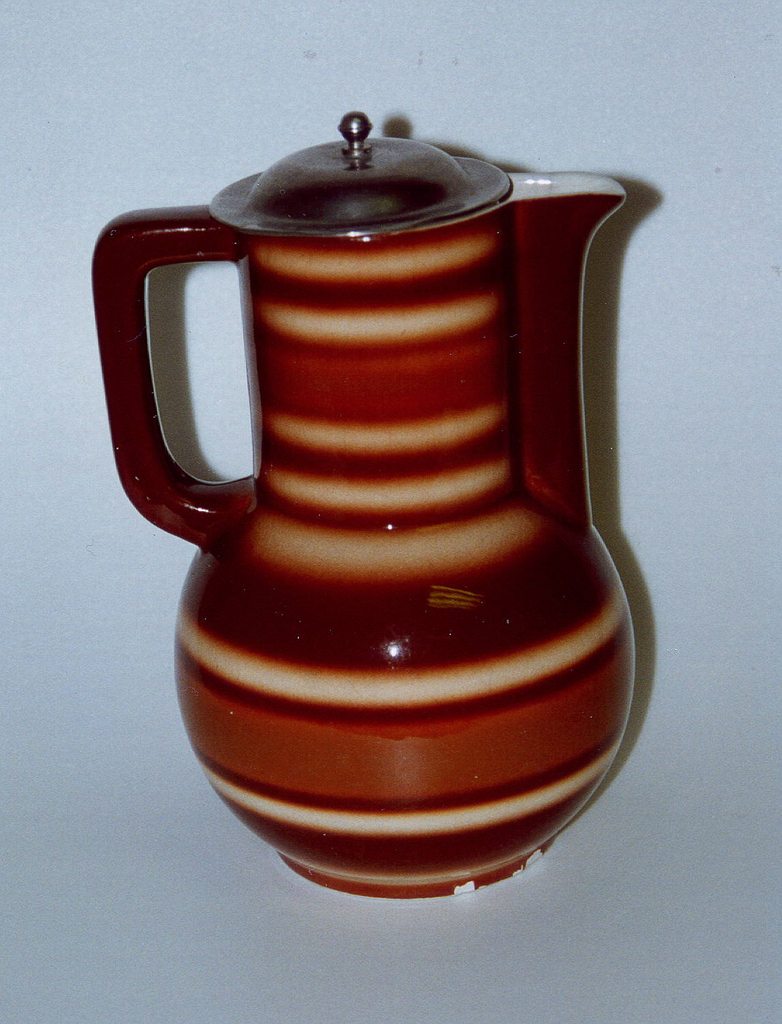 Jug (Germany); Manufactured by Carstens-Graefenroda (Germany); glazed earthenware and metal; height 21.5, width 15, depth 13; Gift of Victor Wiener; 1997-170-24-a,b