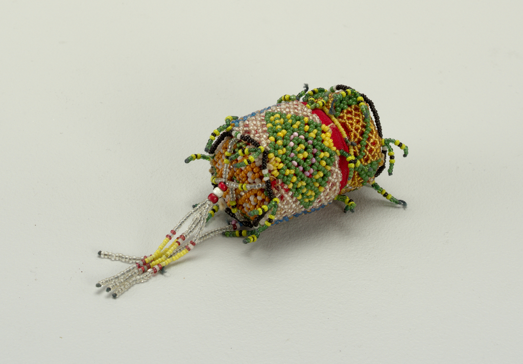 This is a Container. It is dated early 20th century and we acquired it in 1999. Its medium is plant material, cotton, glass beads and its technique is basketry, plain weave, strung beadwork. It is a part of the Textiles department.