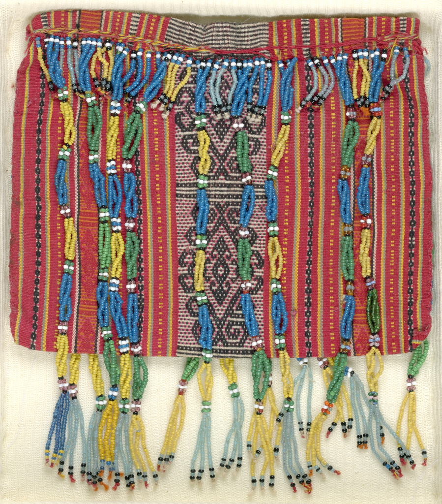 This is a Bag. It is dated early 20th century and we acquired it in 1999. Its medium is cotton, glass beads and its technique is plain weave with supplementary warp and weft patterning, strung beadwork. It is a part of the Textiles department.