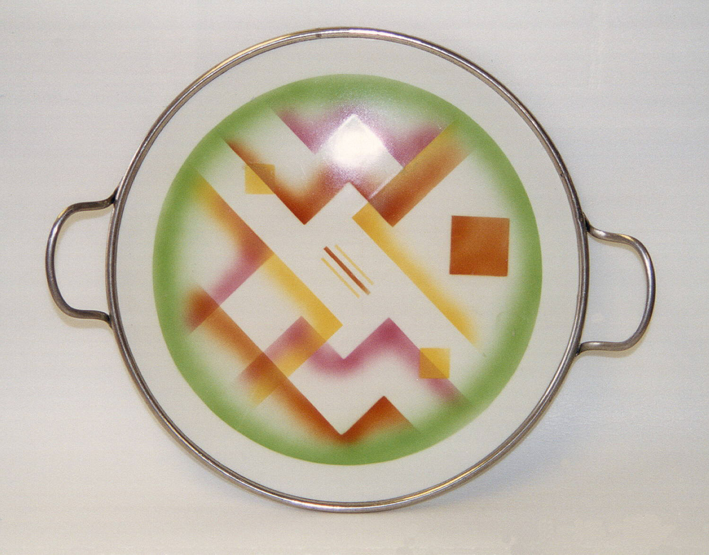 This is a tray. It was manufactured by Grünstadt. It is dated ca. 1930 and we acquired it in 1998. Its medium is glazed earthenware, metal. It is a part of the Product Design and Decorative Arts department.