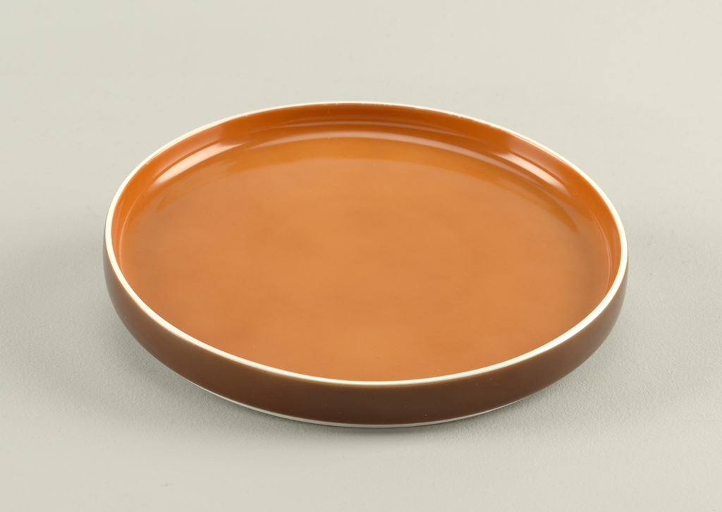 This is a plate. It was designed by Gerald Gulotta. It is dated designed 1970, marketed 1971–73 and we acquired it in 1999. Its medium is glazed porcelain. It is a part of the Product Design and Decorative Arts department.