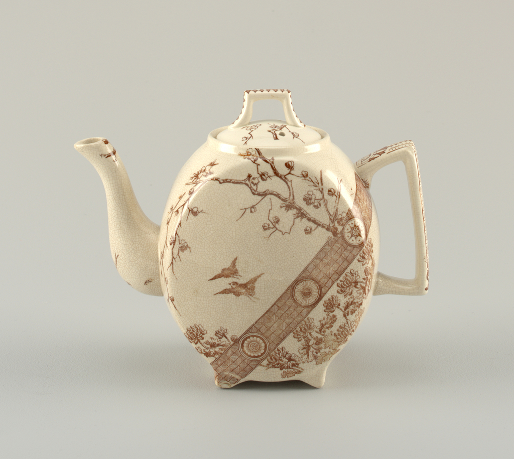 This is a teapot. It was manufactured by Francis J. Emery. It is dated ca. 1878–85 and we acquired it in 1999. Its medium is glazed earthenware with transfer-printed decoration. It is a part of the Product Design and Decorative Arts department.