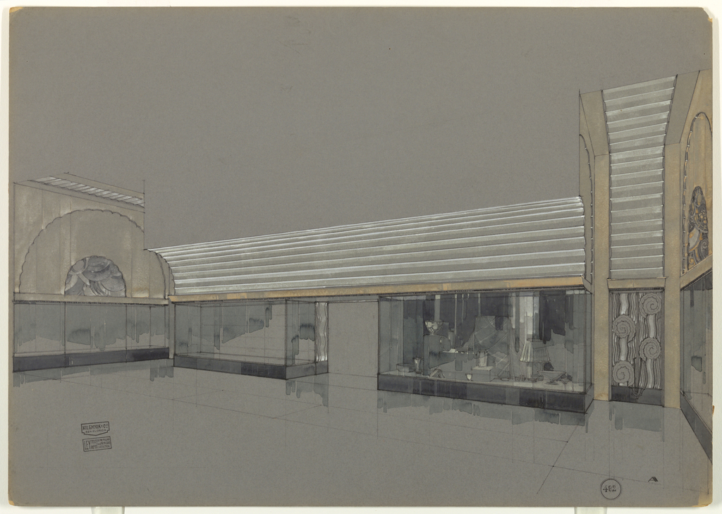 This is a Drawing. It was designed by Kilemnik & Cia. It is dated ca. 1925 and we acquired it in 1999. Its medium is brush and green-gray wash, watercolor, white and beige gouache, graphite on light gray paperboard. It is a part of the Drawings, Prints, and Graphic Design department.