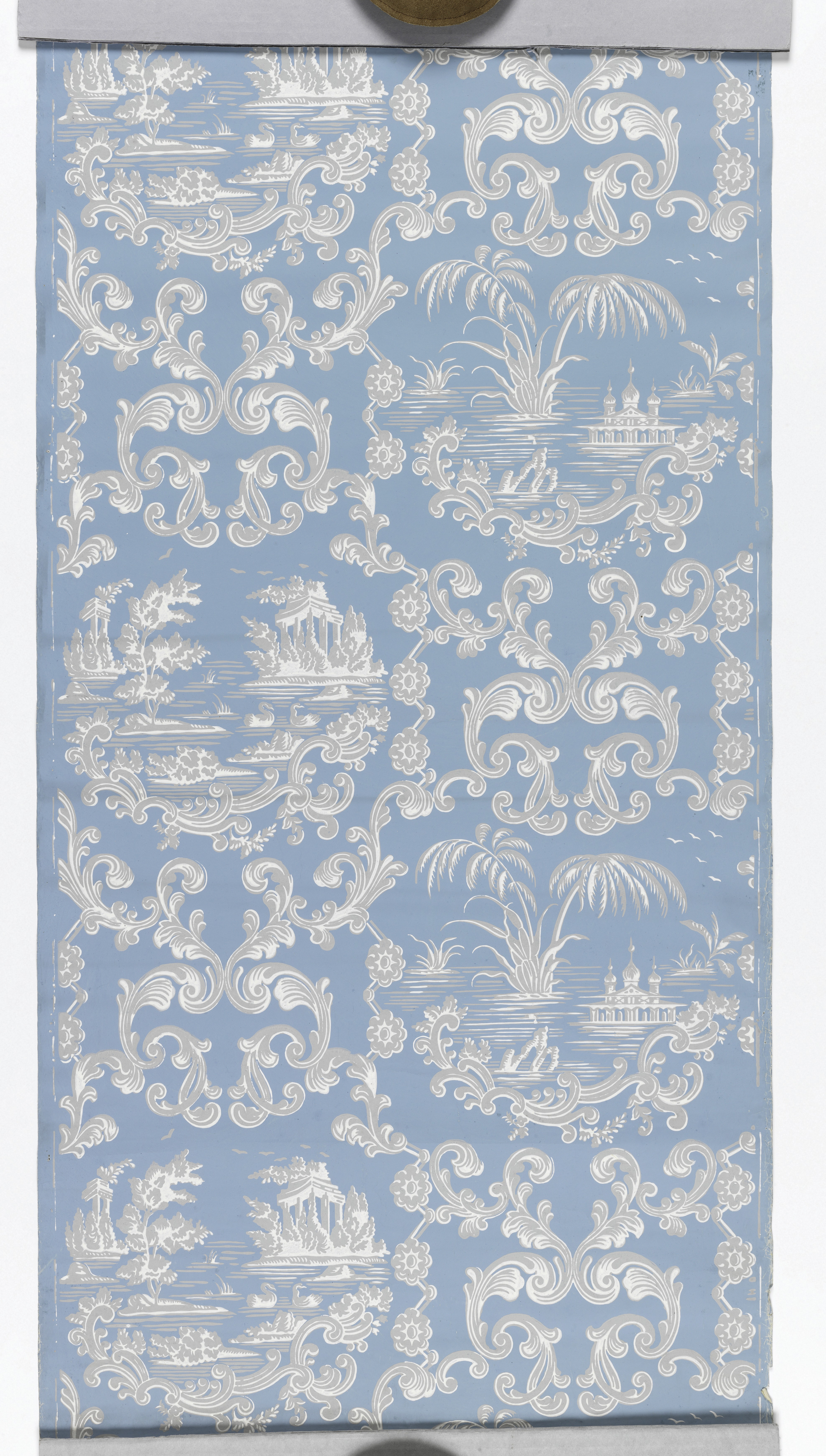 This handsome nineteenth century French paper features a block printed pattern of white and gray on a powder-blue background. Rococo Revival scrollwork frames two alternating landscape vignettes of far off and exotic destinations, and the whole pattern repeats vertically. Once scene show idyllic islands topped with classical columned temples. Wind-blown trees, flying gulls and a pair of dignified swans add romance to the picture. The second landscape presents a spindly mosque, its three onion dome towers stretching upwards towards gigantic palm trees. The mosque, too, sits on an island amid tranquil waters. Sections of foliate scrollwork separate the two scenes, and match the frames that border them.