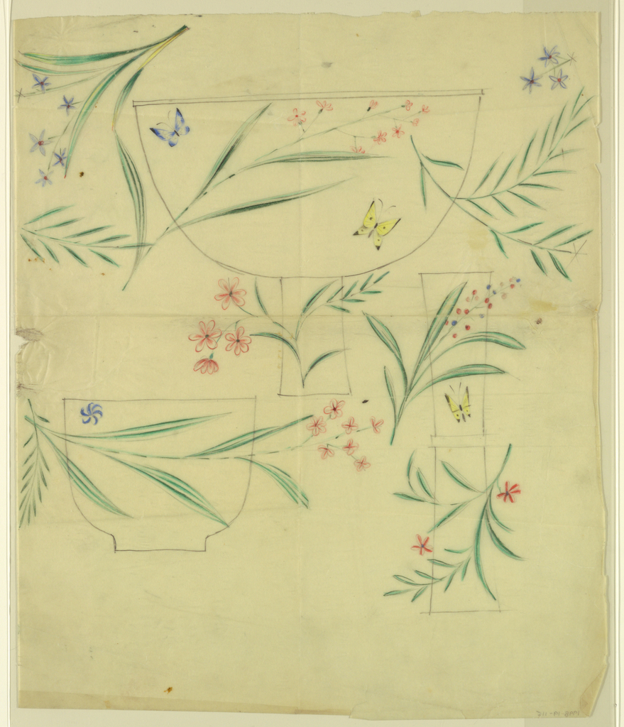 Drawing, Asian-inspired tableware designs; Designed by Tommi Parzinger (American, b. Germany, 1903–1981); brush and gouache, graphite on paper, lined; Sheet: 44 x 34.5 cm (17 5/16 x 13 9/16 in.); Gift of Donald Cameron; 1998-19-115