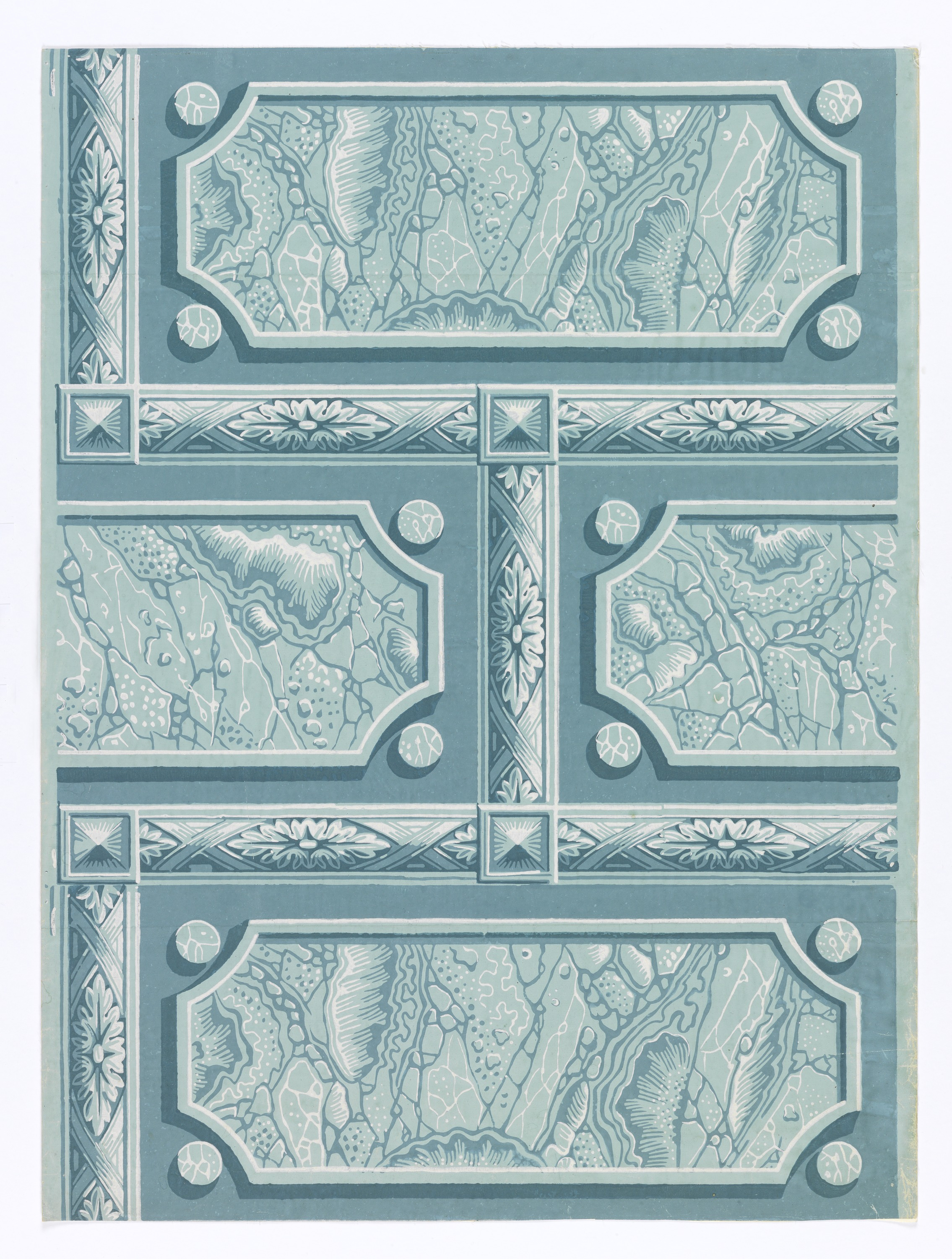 An elaborate imitation stone or ashlar block design printed in a cool palette. Ashlar block papers were used in entries and stair halls, and as dado papers in other rooms, to create a stately and solid impression for visitors entering the home. Due to the cold and rigid nature of the printed stone surface these papers were not usually used in rooms where guests were entertained.