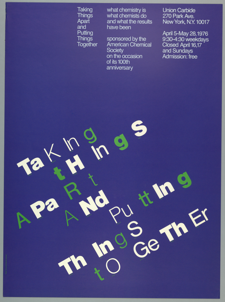 Poster, Taking Things Apart and Putting Things Together, for the American Chemical Association; Designed by Chermayeff & Geismar Associates (United States); USA; offset lithograph on white wove paper; 86.4 x 61.0 cm (34 x 24 in. ); Gift of Ken Friedman; 1997-19-225