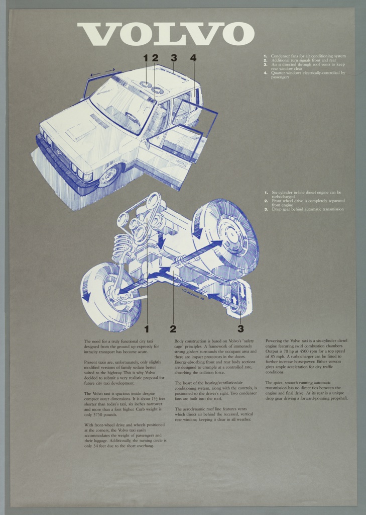 Imprinted in black at lower left center [first column of text]: The ned for a truly functional city taxi / designed from the ground up expressly for / intracity transport has become acute. / Present taxis are, unfortunately, only slightly / modified versions of family sedans better / suited to the highway. This is why Volvo / decided to submit a very realistic proposal for / future city taxi development. / The Volvo taxi is spacious inside despite / compact outer dimensions. It is about 1 1/2 feet / shorter than today's taxi, six inches narrower / and more than a foot higher. Curb weight is / only 34 feet due to the short overhang. Lower center[second column of text]: Body construction is based on Volvo's "safety / cage" principles. A framework of immensly / strong girders surrounds the occupant area and / there are impact protectors on the doors. Energy-absorbing front and rear body sections / are designed to crumple at a controlled rate, / absorbing the collision force. / The heart of the heating/ventilation/air / conditioning system, along with the controls, is / positioned to the driver's right. Two condenser / fans are built into the roof. / The aerodynamic roof line features vents / which direct air behind the recessed, vertical / rear windows, keeping it clear in all weather. Lower right[third column of text]:Powering the VOlvo taxi is a six-cylinder diesel / engin featuring swirl combustion chambers. / Output is 70mph at 4500 rpm for a top speed / of 85 mph. A turbocharger can be fitted to / further increase horsepower. Either version / gives ample accleration for city traffic / conditions. / The quiet, smooth running automatic / transmission has no direct ties between the / engine and final drive. At its rear is a unique drop gear driving a forward pointing propshaft.