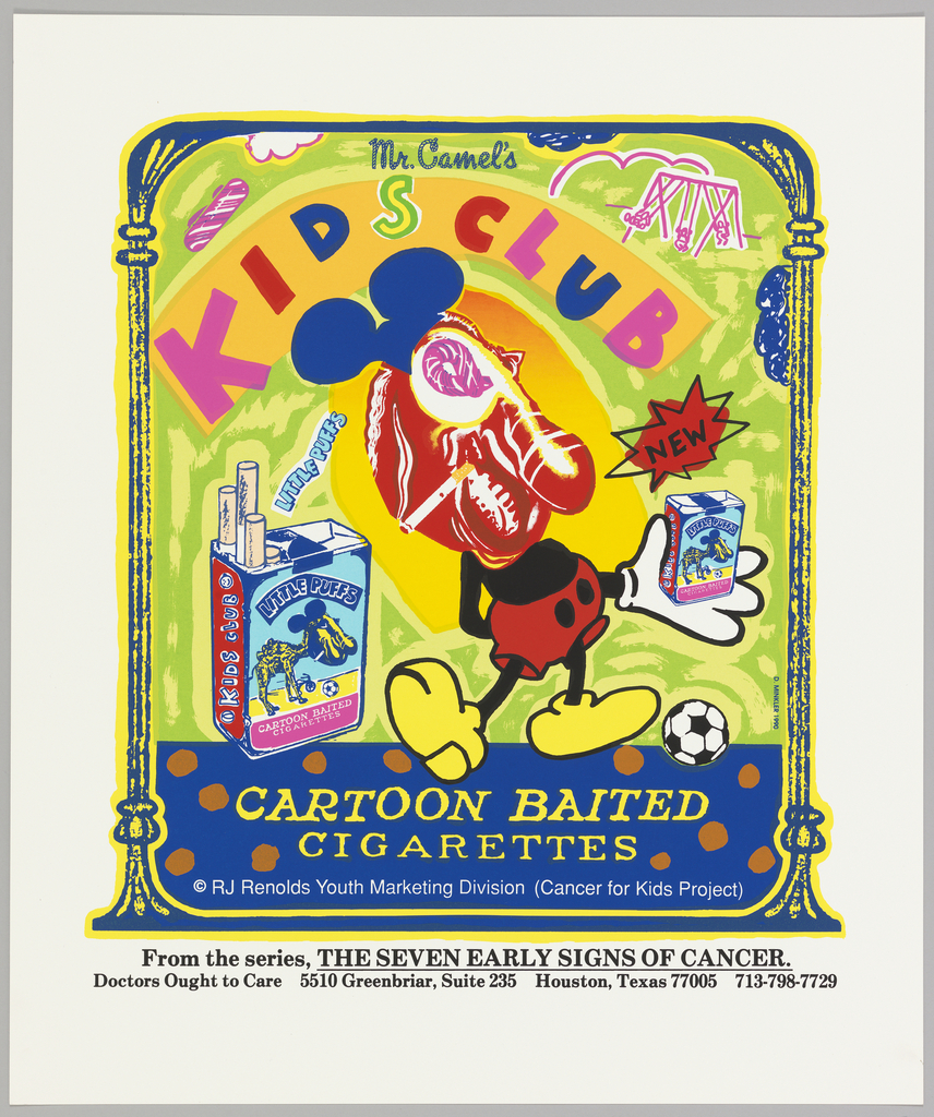 Studies published by the Journal of the American Medical Association in 1992 showed that animal characters appearing in cigarette ads appeal strongly to children. Many activists petitioned retailers to stop posting images of “Joe Camel.” Minkler’s poster conflates the camel’s nose with human genitalia, reflecting a popular view at the time that Joe Camel’s portrait was a deliberate form of subliminal suggestion.