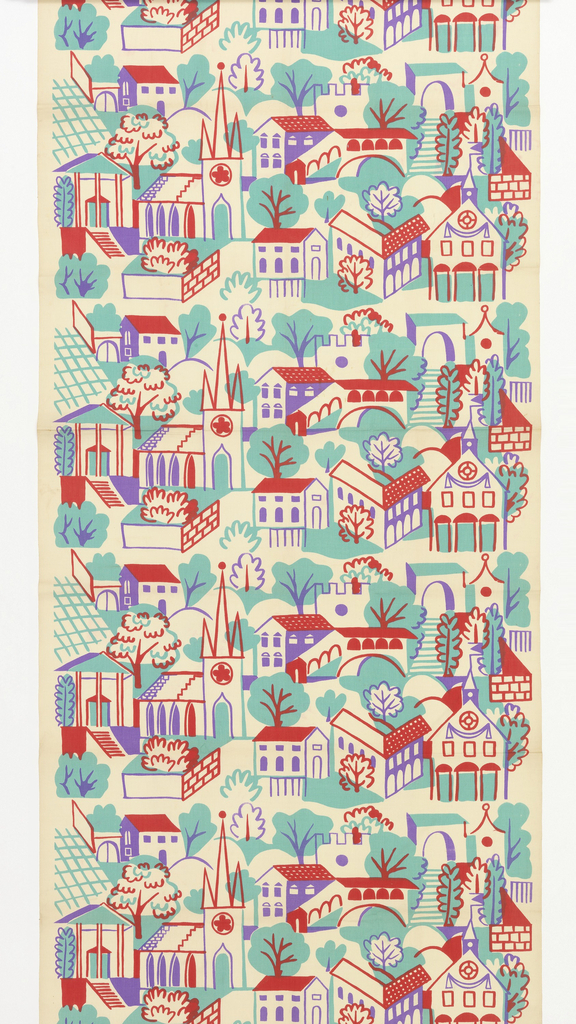 Textile, Village; Designed by Alexander Hayden Girard (American, 1907–1993); USA; cotton; H x W: 233 × 91.1 cm (7 ft. 7 3/4 in. × 35 7/8 in.) Repeat H: 47.6 cm (18 3/4 in.); Gift of Alexander H. Girard; 1969-165-59