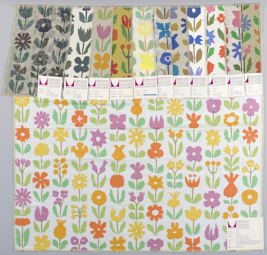 This is a Sample. It was designed by Alexander Hayden Girard and manufactured by American Art Textile Printing Company, Inc. and produced by Herman Miller Textiles. It is dated 1960 and we acquired it in 1969. Its medium is cotton; small samples include linen, rayon, goat hair, mohair, polyester, fibranne and its technique is screen printed on plain weave; one small sample is twill weave. It is a part of the Textiles department.